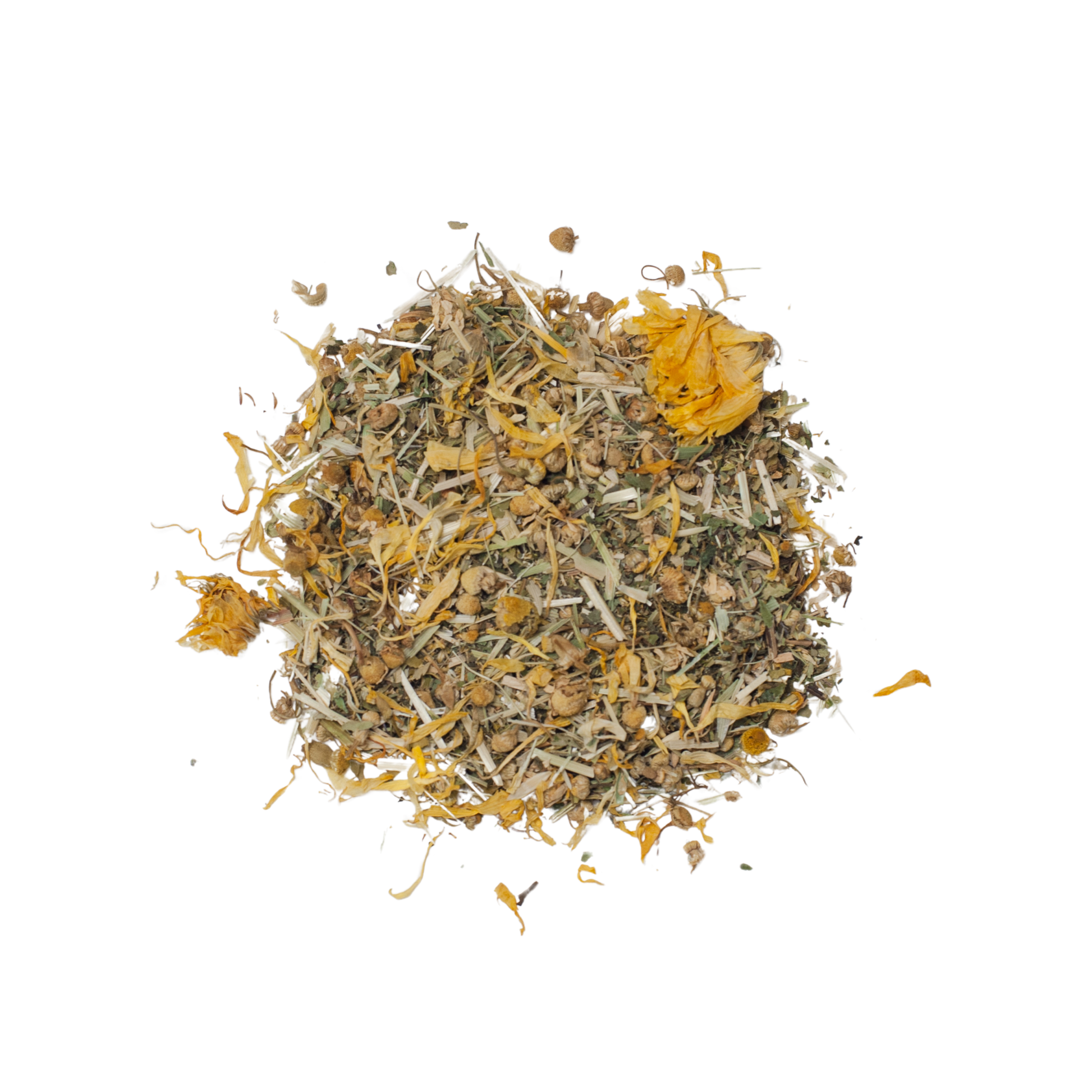 Unwind is thoughtfully formulated to help you to release the stress of the day and embrace a peaceful evening before sleep. Chamomile, widely known for its soothing qualities, eases stress and helps your mind and body prepare for sleep. Lemon balm supports your nervous system and helps to quiet racing thoughts. Passionflower enhances GABA activity, calming the central nervous system and helping you drift into deeper sleep. Oatstraw brings nourishing support to the body and soothes anxiety, while the golden blooms of the Calendula flower provide gentle anti-inflammatory aid.